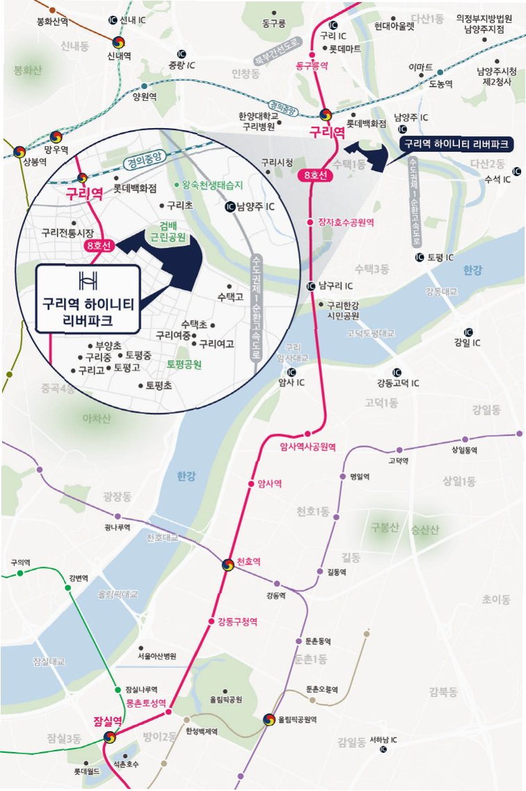 구리역 하이니티 리버파크는 지하철 8호선과 경의중앙선 환승역인 구리역이 직선거리 800m 내에 위치해 있습니다. 이를 통해 잠실역까지 20분대, 삼성역, 봉은사역, 종각역까지 30분대에 이동이 가능합니다. 직주근접 입지를 중요하게 생각하는 수요자들에게 매력적인 조건입니다.