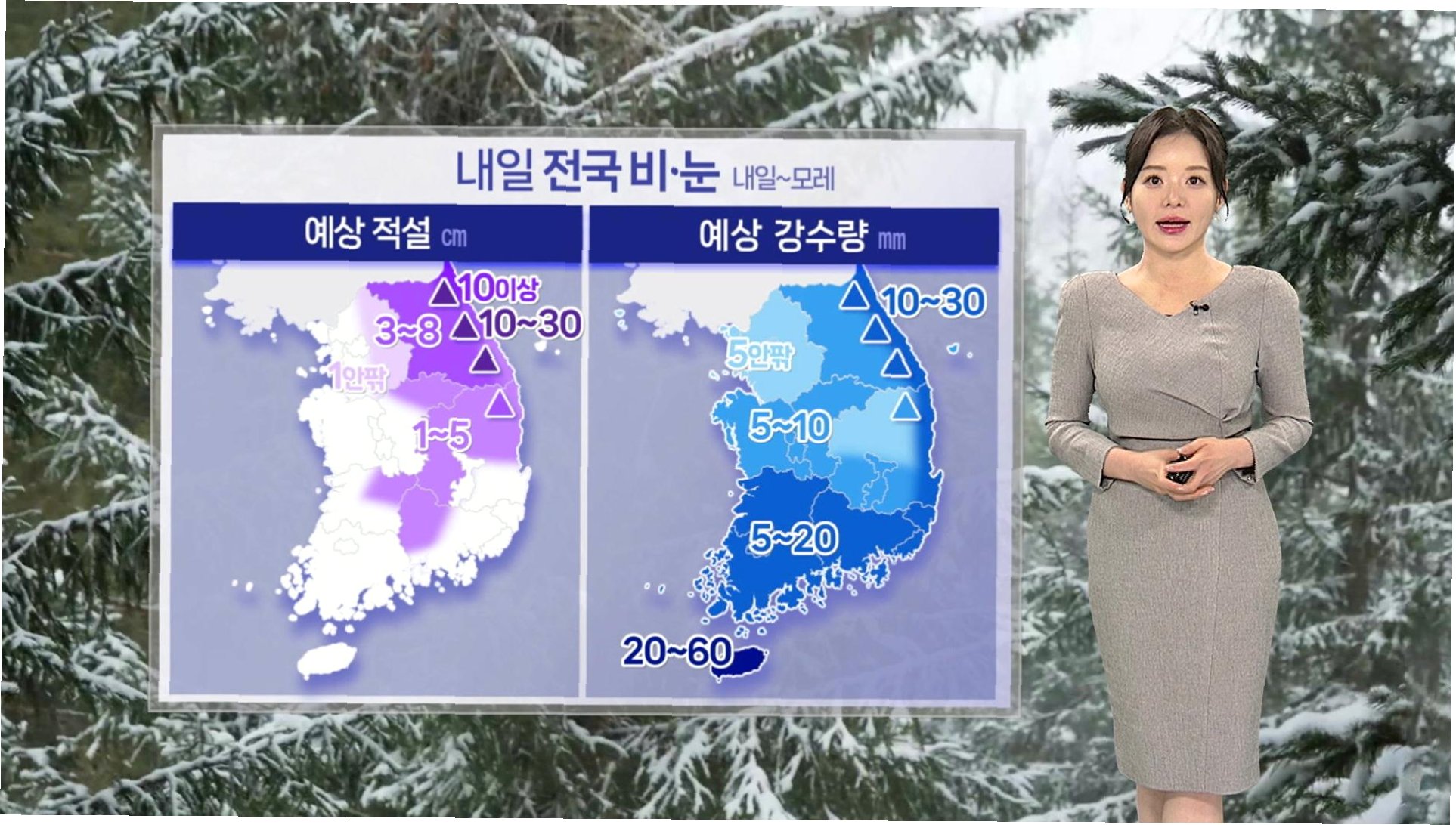 2일부터 3일까지 예상 강수량은 제주도가 20~60mm(산지 80mm 이상)로 가장 많겠으며, 강원 산지 10~40mm, 광주·전남·전북 5~20mm, 부산·울산·경남·경북 동해안 5~20mm 등이 예상됩니다. 강원 산지에는 10~30cm의 많은 눈이 쌓이겠고, 경기 동부 1~5cm, 충북 북부 1~5cm, 전북 북동부 1~5cm, 경북 북동산지 5~10cm 등의 적설량이 예상됩니다. 옷차림과 이동 시 참고하시기 바랍니다.