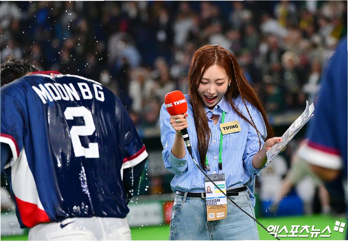 A.한국 야구대표팀의 승리를 축하하는 세리머니의 일환으로, 동료 선수들이 문보경 선수와 함께 인터뷰 중이던 박지영 아나운서에게 아이스박스의 물과 얼음을 쏟았습니다.