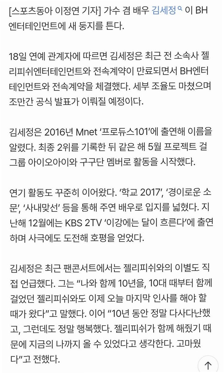 최근 팬 콘서트에서 김세정은 10년간 함께 해온 젤리피쉬엔터테인먼트와의 이별을 직접 언급하며 진솔한 마음을 전했습니다. 그녀는 "10년 동안 정말 다사다난했고, 그런데도 정말 행복했다. 젤리피쉬가 함께 해줬기 때문에 지금의 나까지 올 수 있었다고 생각한다. 고마웠다"고 말하며 지난 시간을 돌아봤습니다. 젤리피쉬와의 동행은 끝났지만, 김세정은 새로운 시작을 앞두고 있습니다.