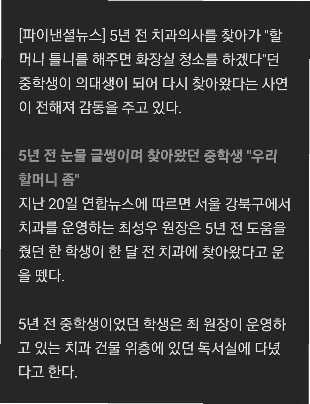 서울 강북구에서 치과를 운영하는 최성우 원장은 최근 5년 전 도움을 주었던 한 중학생의 방문을 받았습니다. 당시 학생은 할머니께서 오래된 틀니 때문에 식사를 제대로 하지 못하는 안타까운 사정을 전하며, 치료비를 마련하기 위해 치과 화장실 청소를 하겠다고 제안했습니다. 최 원장은 어린 학생의 간절한 마음에 흔쾌히 치료를 도왔으며, 학생은 이때부터 '의사가 되고 싶다'는 꿈을 키우기 시작했습니다.