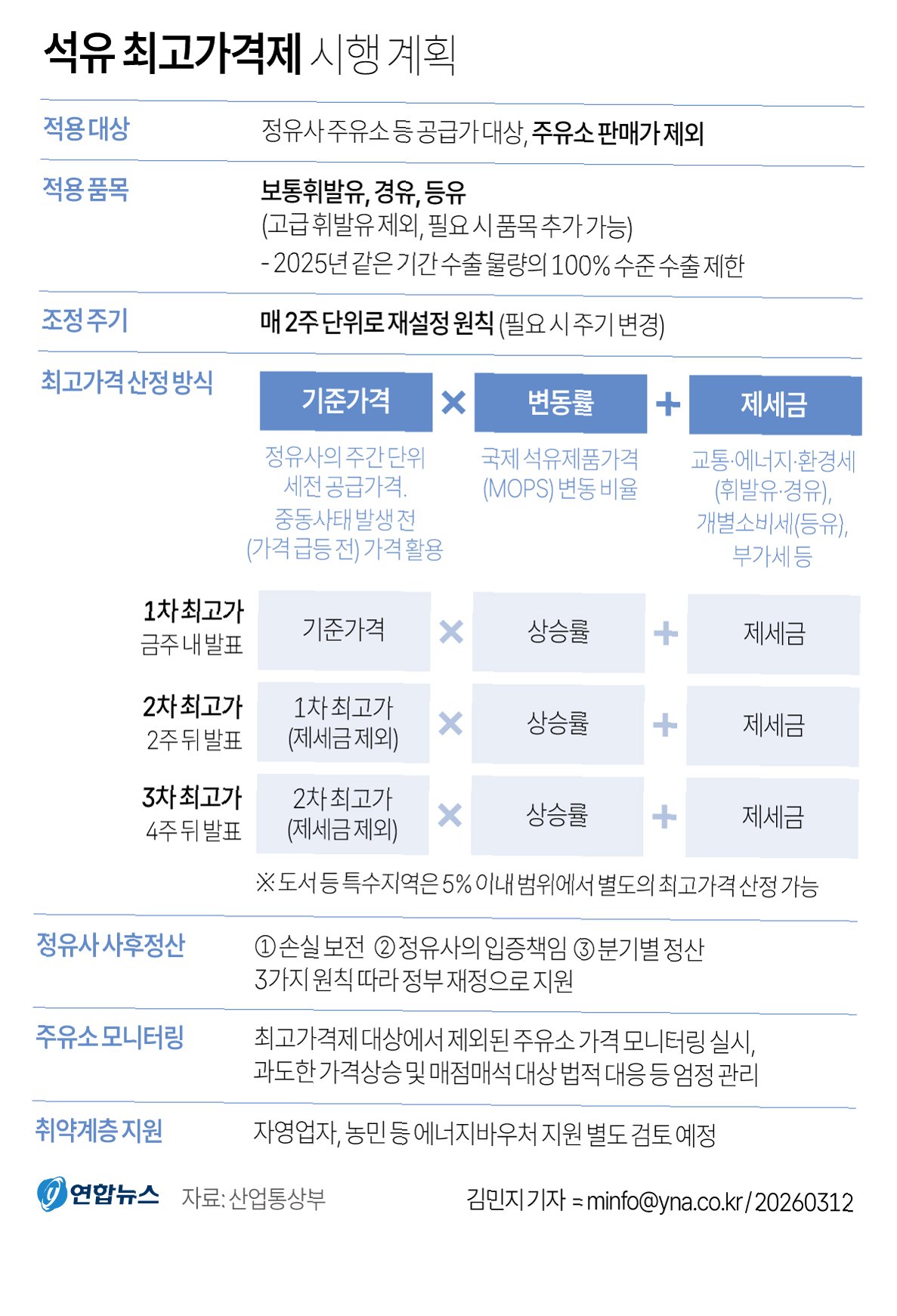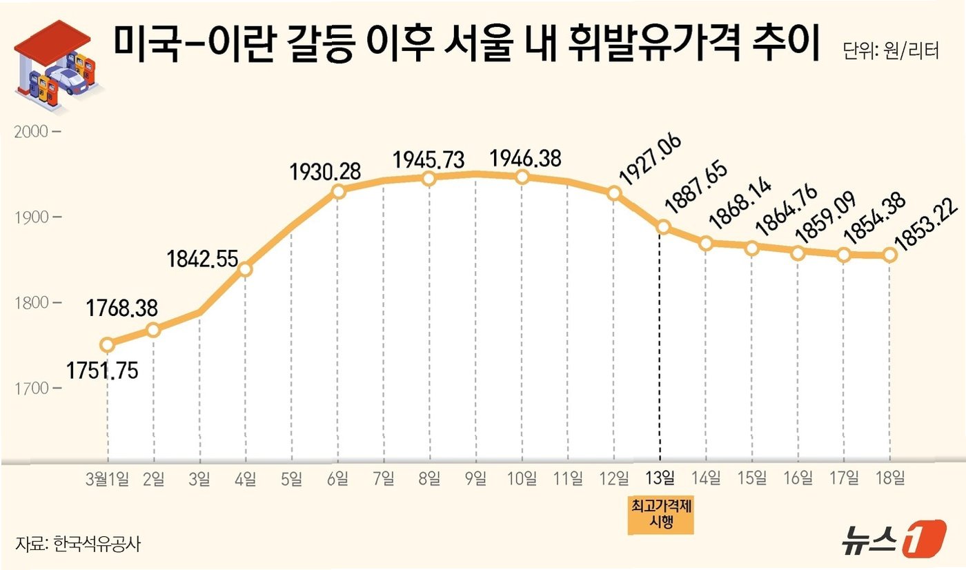 정유사가 주유소에 공급하는 2차 석유 최고가격이 오늘 자정부터 휘발유는 ℓ당 1,934원, 경유 1,923원, 등유 1,530원으로 인상됩니다. 이는 2주 전 1차 최고 가격 지정 시점보다 유종별로 모두 210원씩 오른 수치입니다. 정부는 국제유가 상승률과 국민 생활에 미치는 영향을 종합적으로 고려하여 이번 최고가격을 지정했다고 밝혔습니다. 또한, 유류세 추가 인하분도 함께 반영되었습니다.