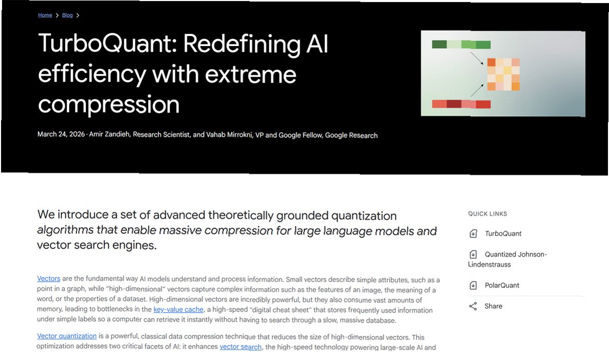 구글이 AI 메모리 사용량을 획기적으로 줄이는 '터보퀀트' 기술을 공개하며 메모리 시장에 새로운 바람을 일으키고 있습니다. 이 기술은 대규모 언어 모델(LLM)의 핵심인 'KV 캐시'를 최대 6분의 1로 압축하면서도 성능은 유지하는 놀라운 알고리즘입니다. 지난해 공개된 논문에 기반한 이 기술은 AI 시스템의 성능과 비용을 제약하던 병목 현상을 해결할 열쇠로 주목받고 있습니다. 사이버보안 기업 클라우드플레어의 매슈 프린스 CEO는 이를 '구글의 딥시크'라 칭하며, 적은 자원으로 동일한 성능을 구현하는 혁신성을 높이 평가했습니다.