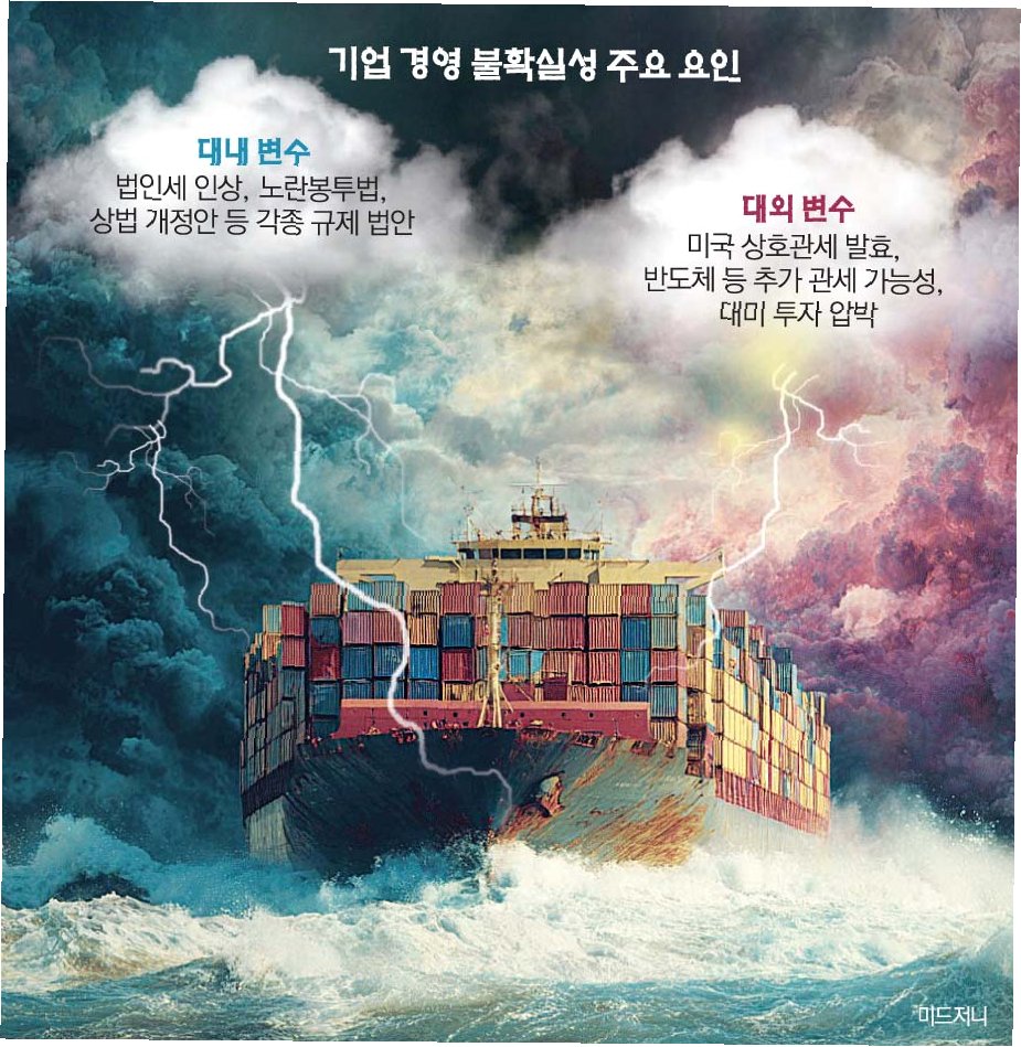우리 기업들이 벼랑 끝에 몰렸다미국 관세정책으로 수출 장벽이 높아진 가운데 노란봉투법(노동조합법 제2·3조 개정안)과 상법 2차 개정안 등 패키지 규제도 급물살을 타고 있어서다. 여기에 최근 이재명 정부가 법인세 인상까지 들고나오면서 기업들은 그야말로 '사면초가'에 놓이게 됐다. 정부는 '친(親)기업 정책 보따리'를 약속하며 달래기에 나섰지만, 기업들의 우려는 여전한 상황이다.