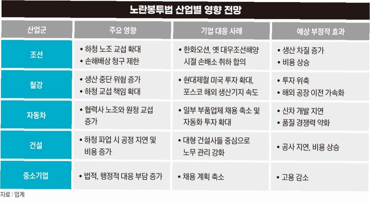 특히 하도급 노동자에 관한 원청 책임 강화와 쟁의행위 범위 확대를 골자로 한 노란봉투법에 대한 기업들의 우려는 상상 이상이다. 특히 다단계 협업체계인 자동차·조선·철강·건설 업계 등은 하청 노조의 교섭 요구와 파업이 빈번하게 발생하면 산업 경쟁력 저하가 불가피하다. 일각에서는 산업 생태계가 무너질 가능성마저 있다는 목소리가 나온다.