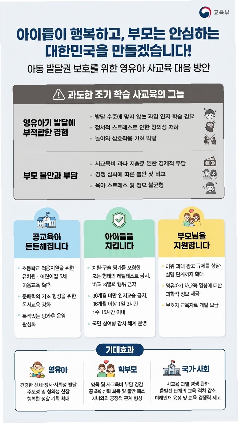 교육부가 3세 미만 영유아를 대상으로 하는 영어, 수학 등 주입식 교육을 전면 금지하는 방안을 추진합니다또한 3세 이상 영유아에게도 취학 전 하루 3시간 이상 교과 위주 주입식 교육을 하는 학원을 규제합니다이는 사실상 종일제 유치원처럼 운영되는 영어유치원을 겨냥한 조치로, 국가인권위원회의 권고에 따른 후속 대책입니다교육부는 학원법 개정을 통해 '인지 교습'을 제한하고, 놀이·돌봄·예체능 활동은 예외로 인정할 방침입니다.