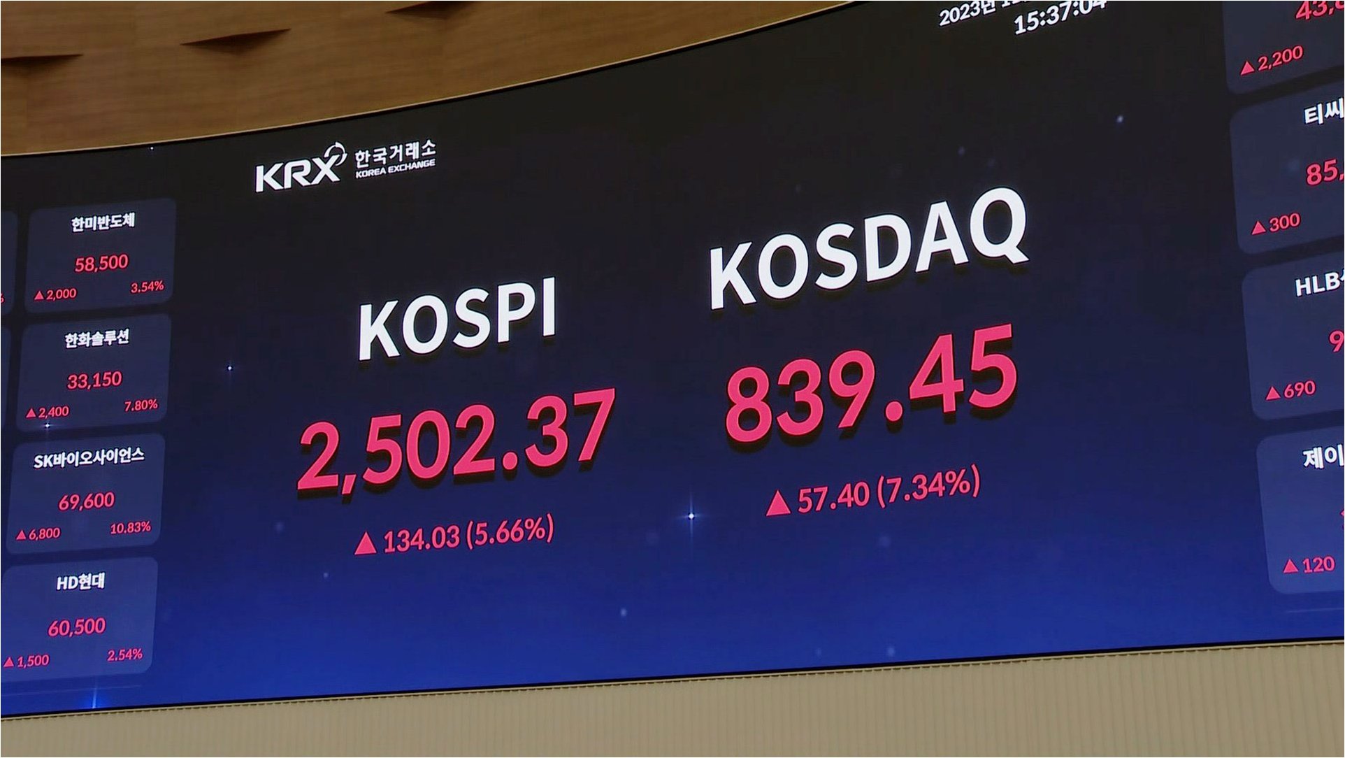 코스닥 시장 역시 약 한 달 만에 매수 사이드카가 발동될 정도로 뜨거운 상승세를 기록했습니다. 코스닥지수는 6.06% 상승하며 마감했습니다. 코스닥 시장에서는 외국인과 기관이 각각 4439억 원, 4602억 원을 순매수하며 시장 상승을 이끌었습니다. 에코프로, 에코프로비엠 등 2차전지 관련주와 레인보우로보틱스 등 로봇 관련주가 강세를 보이며 코스닥 시장의 활기를 더했습니다. 삼천당제약만이 유일하게 하락하며 업종별 차별화된 움직임을 보였습니다.