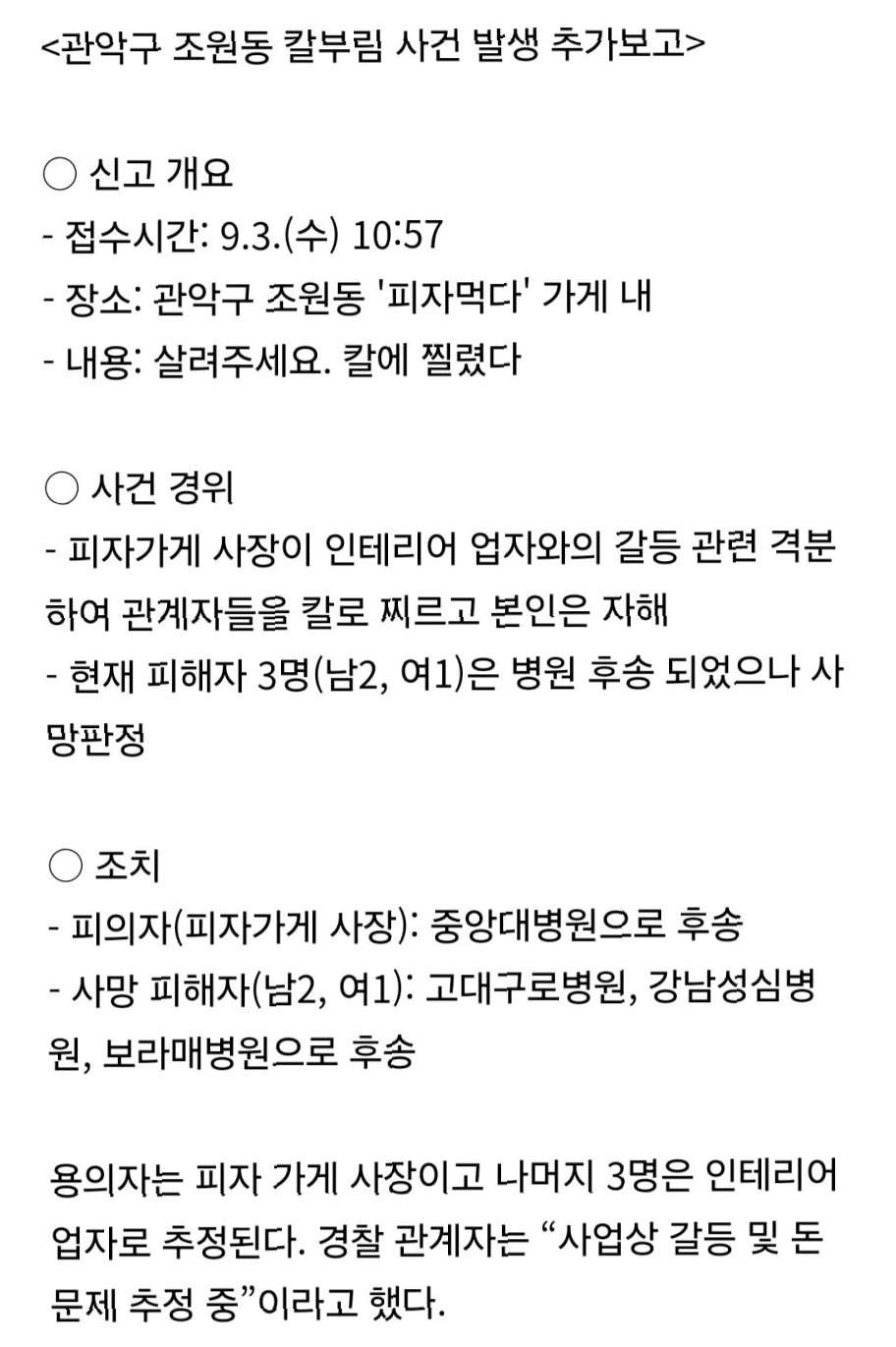 사건의 피의자는 피자 가게 사장 A씨(40대)로, 피해자들을 흉기로 찌른 후 자해를 시도했습니다. 사망한 피해자 3명은 피자 프랜차이즈 본사 임원 1명, 그리고 부녀 관계인 인테리어 업자 2명으로 밝혀졌습니다. A씨는 매장 리뉴얼을 두고 본사와 갈등을 겪고 있었으며, 이는 이번 사건의 주요 원인으로 지목되고 있습니다. 사건 현장은 참혹했고, 그 배경에 자리 잡은 갈등의 깊이를 짐작하게 합니다.