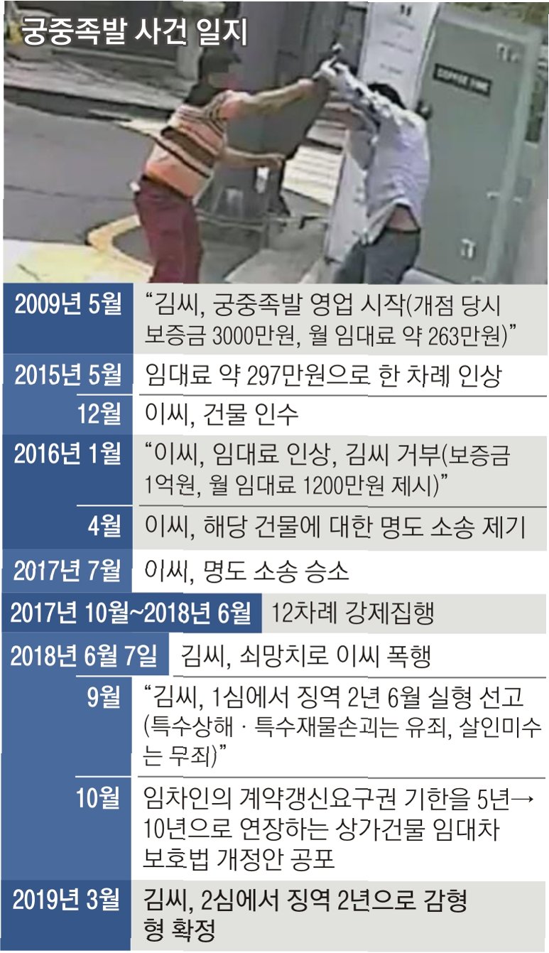 2018년 9월 4일, 임대료 인상 문제로 갈등을 빚어온 건물주를 둔기로 폭행한 ‘궁중족발’ 사장 김모씨의 국민참여재판이 열렸습니다이날 재판의 쟁점은 김씨의 행위에 살인 고의가 있었는지 여부였습니다2009년부터 서울 서촌에서 궁중족발을 운영하던 김씨 부부는 2015년 12월 이모씨가 족발집이 입점한 건물의 소유권을 취득한 뒤 기존보다 4배 높은 임대료를 요구하면서 이씨와 갈등이 시작됐습니다.