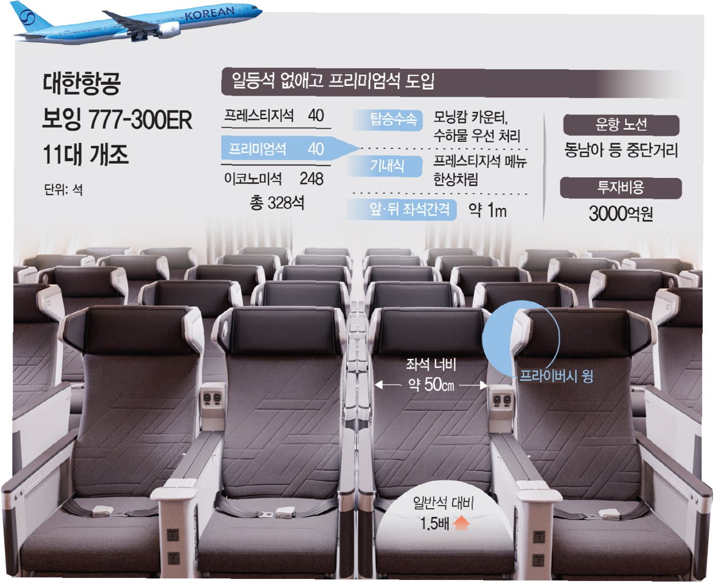 대한항공은 이코노미석 좌석 재배치 계획은 철회했지만, 프리미엄석 도입은 예정대로 진행할 계획입니다. 보잉 777-300ER 항공기에 비즈니스석과 이코노미석 사이 등급인 프리미엄석을 마련하여 중·단거리 노선에 투입할 예정입니다. 프리미엄석 개조 작업은 현재 진행 중이며, 9월 중순부터 운행을 시작할 것으로 예상됩니다.