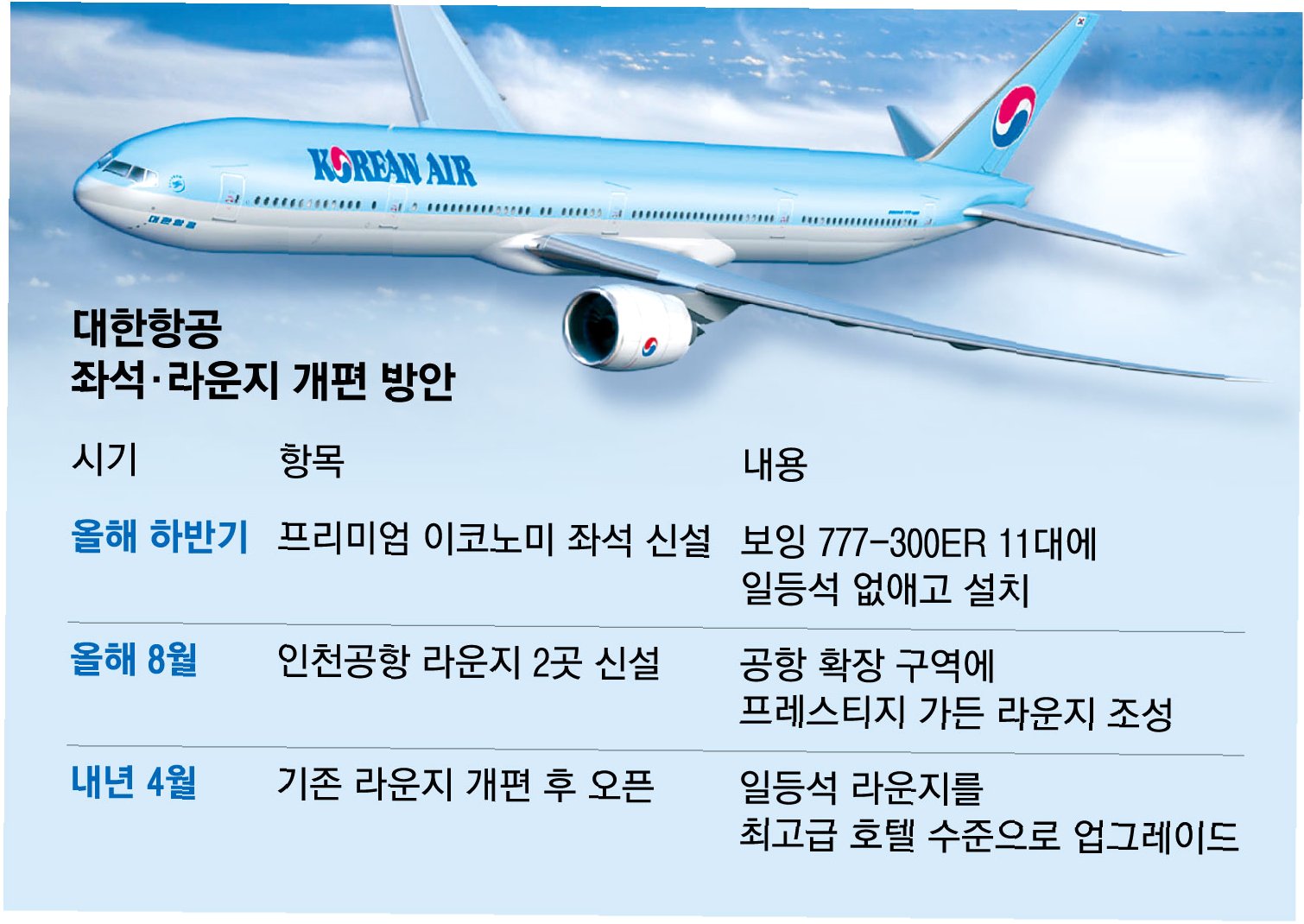 A.프리미엄석 도입은 예정대로 진행될 예정입니다. 보잉 777-300ER 항공기에 프리미엄석을 마련하여 중·단거리 노선에 투입할 계획이며, 9월 중순부터 운행을 시작할 것으로 예상됩니다.
