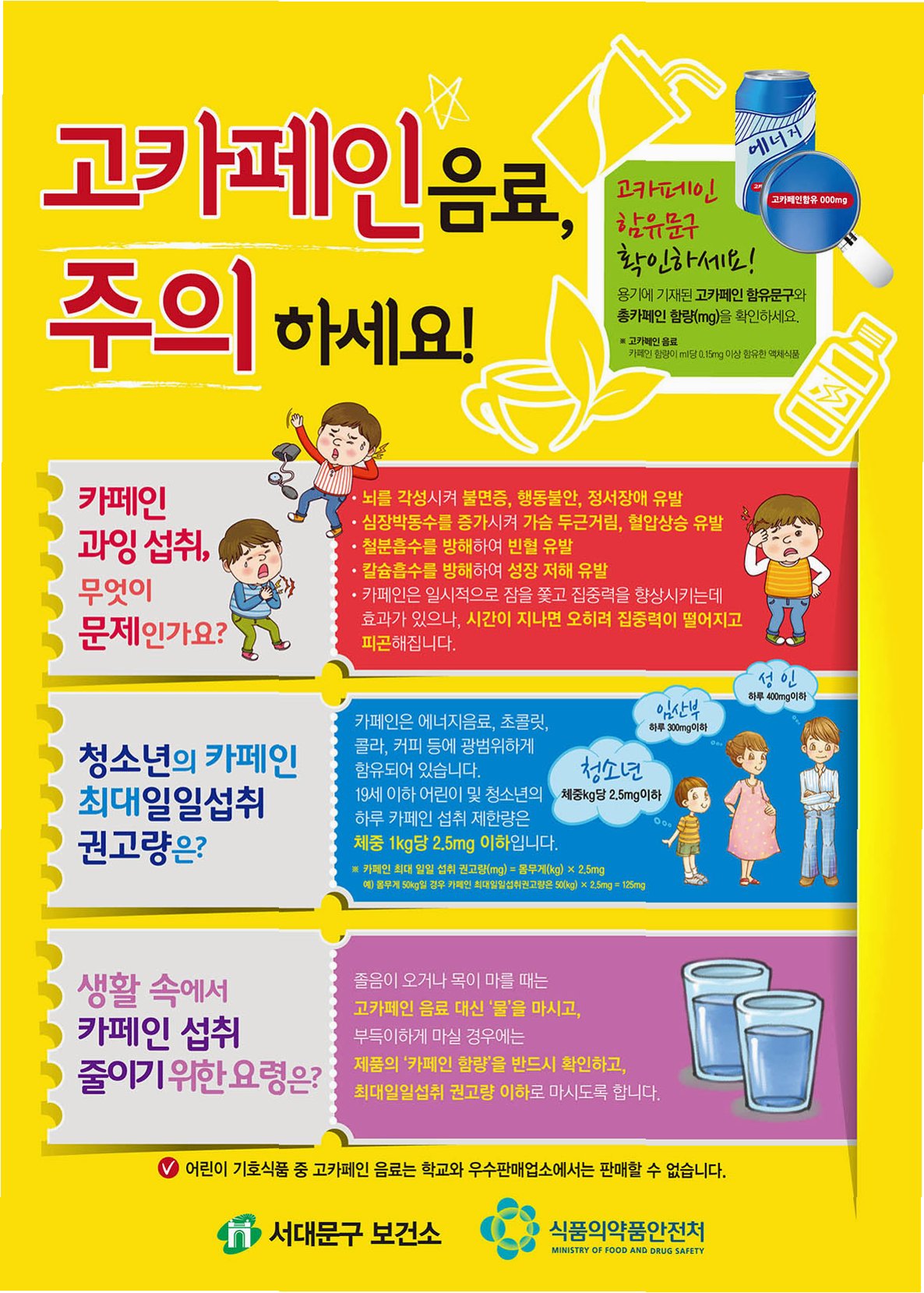 몸무게 60kg 청소년의 카페인 최대 일일섭취권고량은 150mg입니다. 시중에 유통되는 고카페인 음료는 한 캔(250~355ml)에 60~100mg의 카페인이 함유되어 있습니다. 3캔을 마시면 일일섭취권고량의 2배에 이르게 됩니다. 식약처 자료에 따르면, 카페인 과다섭취로 인한 부작용은 심장 박동 수 증가, 가슴 두근거림, 혈압상승을 유발하고 위산 분비 촉진, 위궤양, 위식도역류질환과 같은 위장병의 원인이 됩니다. 또한, 미국에서는 고카페인 음료를 많이 마신 고등학생이 사망하거나 전신경련을 경험했다는 보도도 있었습니다. 이러한 사례들은 고카페인 음료 섭취의 위험성을 보여줍니다.