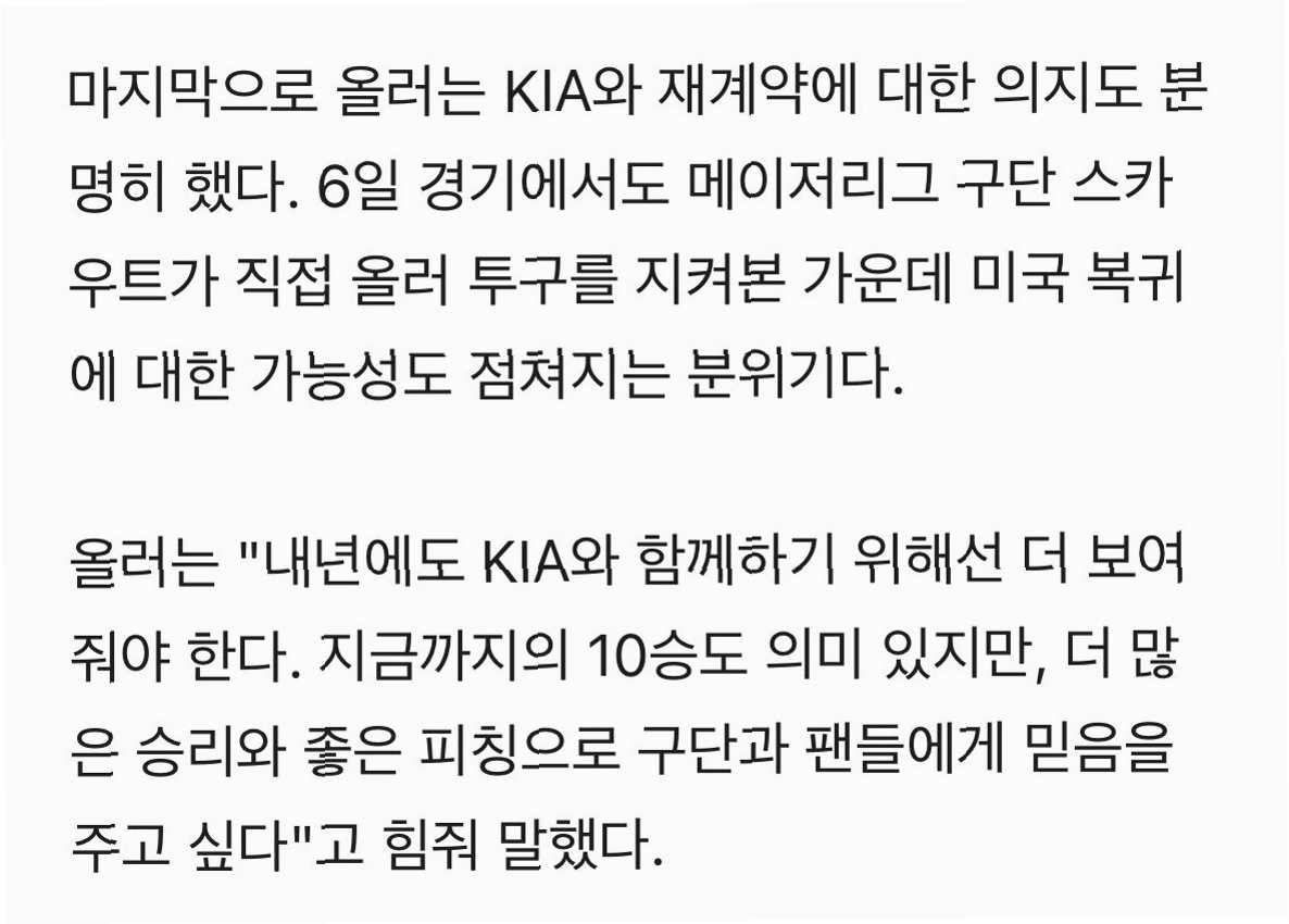 A.올러는 KIA에서 좋은 성적을 거두었고, 팀에 대한 애정을 가지고 있으며, 내년에도 KIA 유니폼을 입고 싶어 하기 때문입니다.