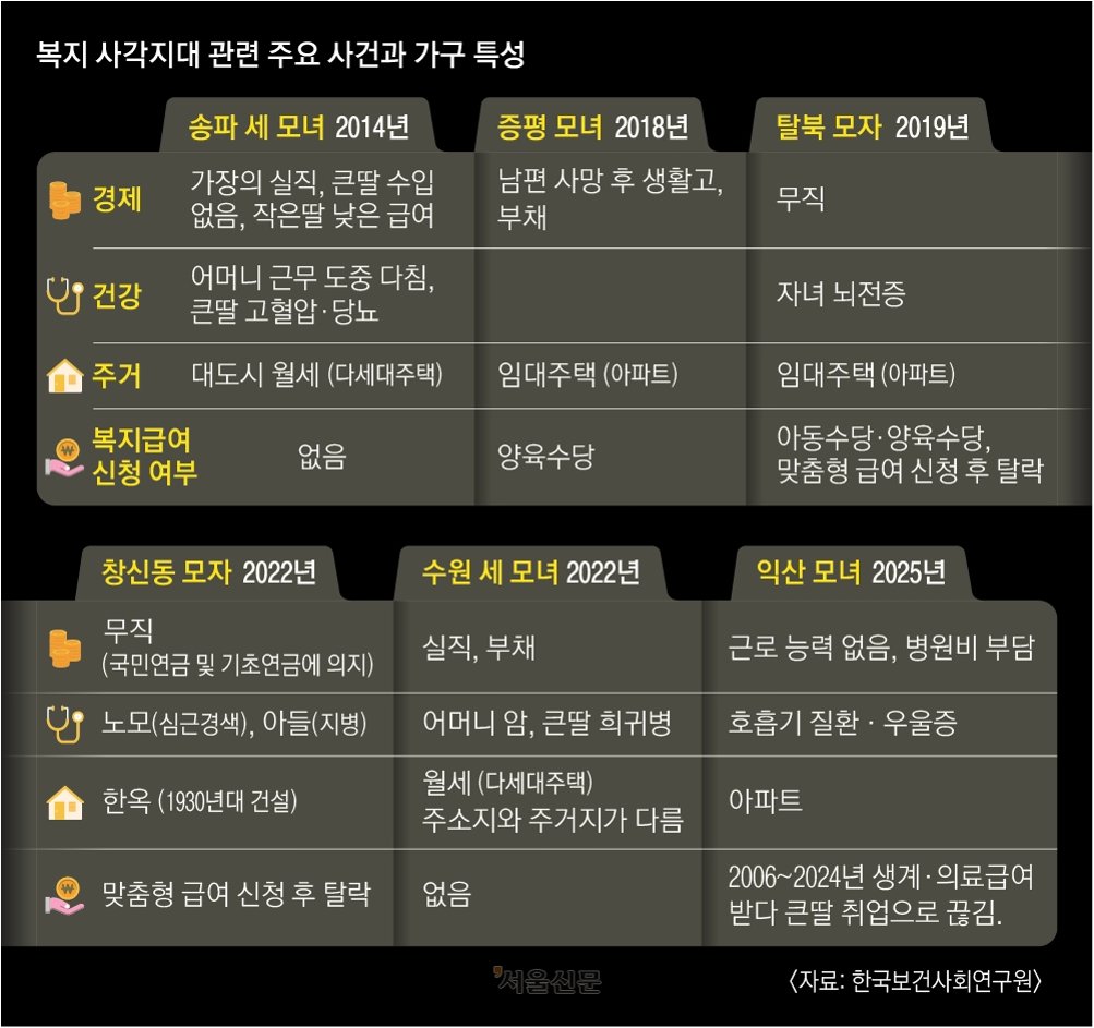 지난 5월 전북 익산에서 생활고를 겪던 모녀가 숨진 채 발견된 안타까운 사건은 우리 사회 복지 시스템의 어두운 면을 드러냈습니다. 소득이 없어 생계급여를 받을 수 있었지만, 실제로 지원을 받지 못해 비극적인 결과를 맞이했습니다. 이는 복지 혜택을 받을 자격이 있음에도 불구하고, 신청 절차를 알지 못하거나, 복잡한 절차에 막혀 지원을 받지 못하는 취약계층이 적지 않음을 보여줍니다. 이처럼 우리나라 복지제도가 국가가 알아서 챙겨주는 게 아니다 보니, 이렇게 신청을 못해서 '사각지대'에 놓이는 취약계층이 적지 않습니다.