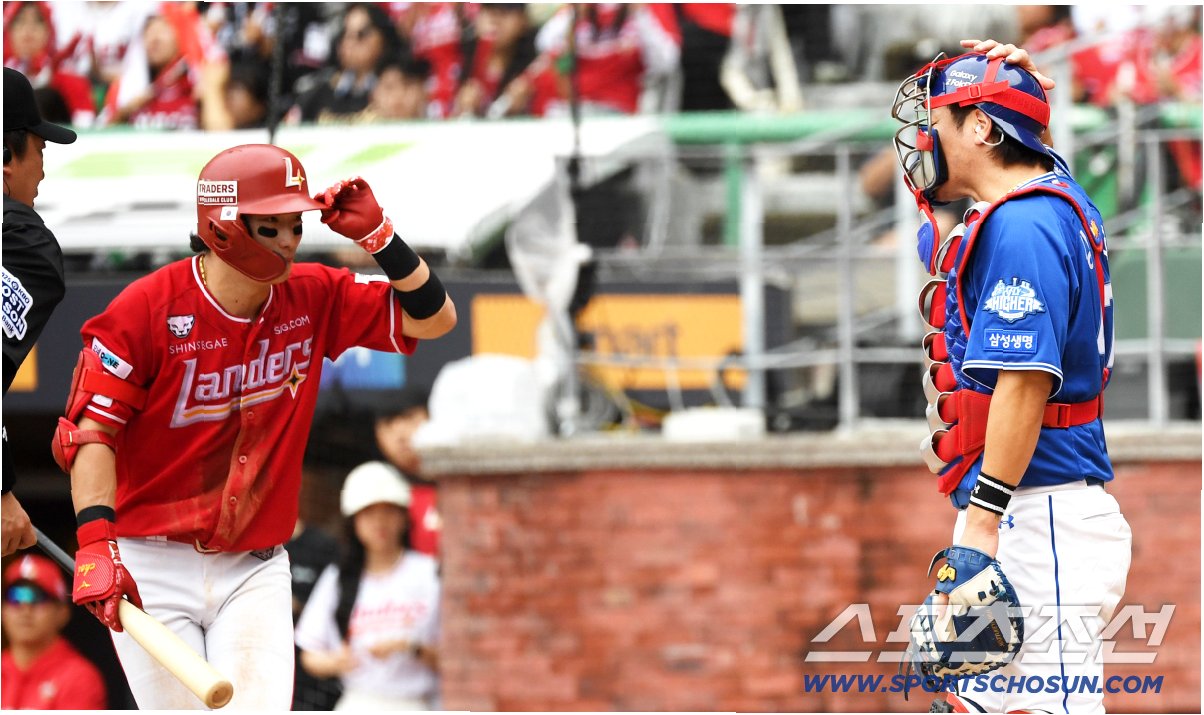 다시 타석에 들어선 최지훈은 포수 강민호에게 다가가 헬멧에 손을 올린 뒤 고개 숙여 미안한 마음을 전했다.