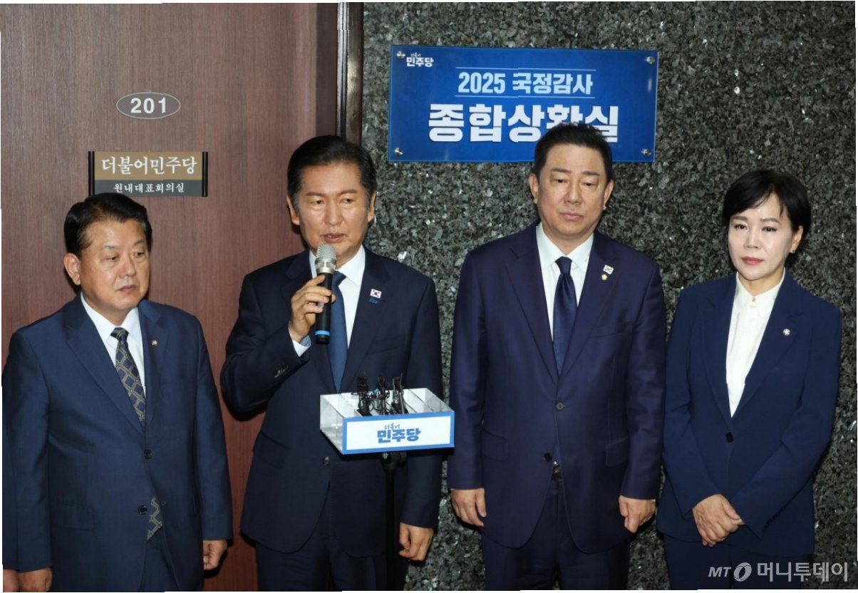 정청래 대표는 국민의힘이 국감 기조를 '독재를 저지하고 내 삶을 지키는 국감'으로 정한 것에 대해 비판적인 입장을 표명했다. 그는 윤석열 정부의 불법 계엄 시도가 이미 국민에 의해 저지되었음을 강조하며, 국민의힘이 미래지향적인 국감 기조를 세울 것을 촉구했다. 아울러, 이재명 정부의 첫 국감에서 기업인 증인 채택을 최소화하고, 완벽한 내란 청산과 민생 문제에 집중할 것을 다짐했다.