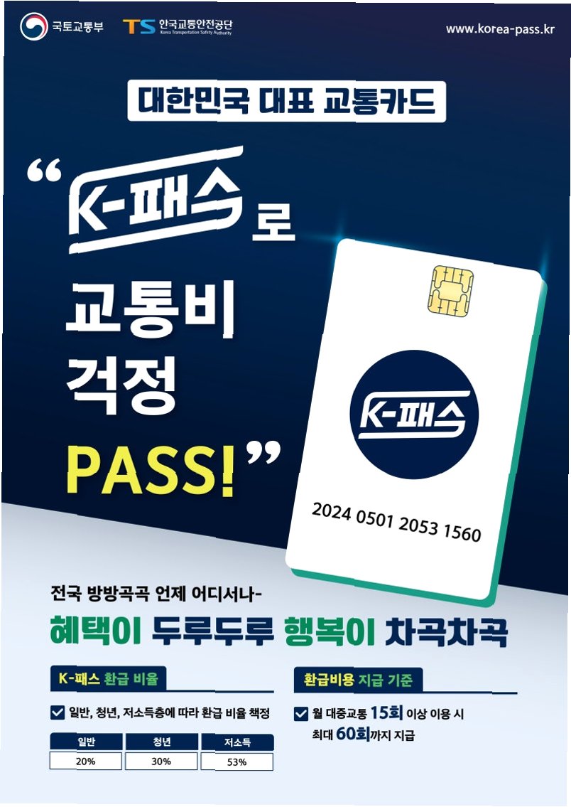 K패스는 이미 많은 국민들의 사랑을 받으며 대중교통 이용 필수 아이템으로 자리 잡았습니다. 지난해 5월 출시 이후 단 1년 5개월 만에 가입자 400만 명을 돌파하며 그 인기를 증명했습니다. K패스는 전국의 시내·마을버스, 지하철, 광역버스, GTX 등을 월 15회 이상 이용할 경우, 지출 금액의 일정 비율(20~53%)을 환급해주는 매력적인 정책입니다. 일반, 청년, 저소득층, 다자녀 가구 등 다양한 유형에 따라 환급률이 차등 적용되어, 더욱 폭넓은 혜택을 제공합니다.