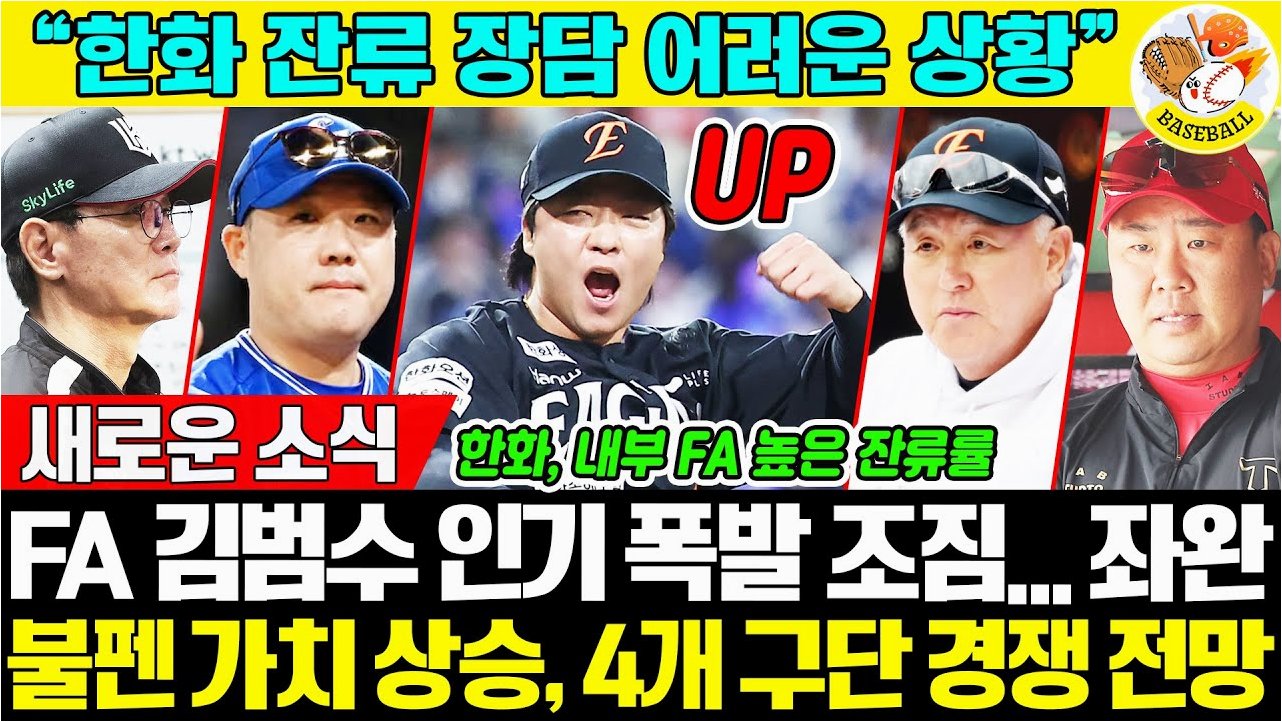 한화는 한국시리즈 준우승을 발판 삼아 다음 시즌 우승을 노리고 있습니다. 이를 위해서는 좌완 불펜 김범수의 역할이 매우 중요합니다. 하지만 김범수를 원하는 팀이 많아 경쟁이 불가피한 상황입니다. 한화는 그동안 내부 FA 선수들을 다른 팀에 거의 빼앗기지 않으며 높은 재계약률을 보여왔습니다. 최근 3년간 외부 FA 영입에 적극적으로 투자하며 내부 FA 선수들의 사기를 북돋우는 데에도 힘쓰고 있습니다. 김범수에게도 섭섭지 않은 대우를 해줄 것으로 예상되지만, 타 구단의 적극적인 영입 경쟁이 변수로 작용할 수 있습니다.