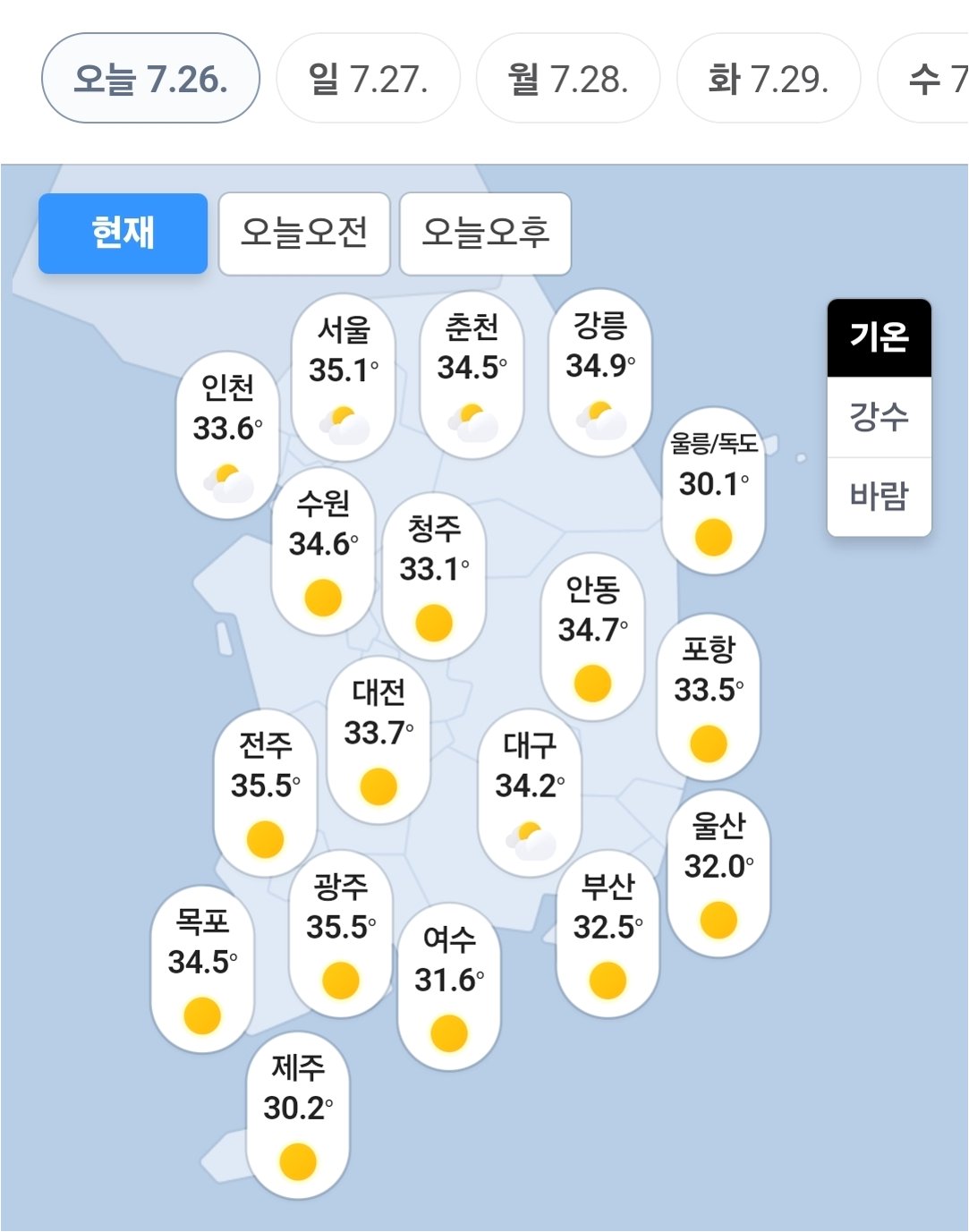 주요 도시별 낮 기온 안내