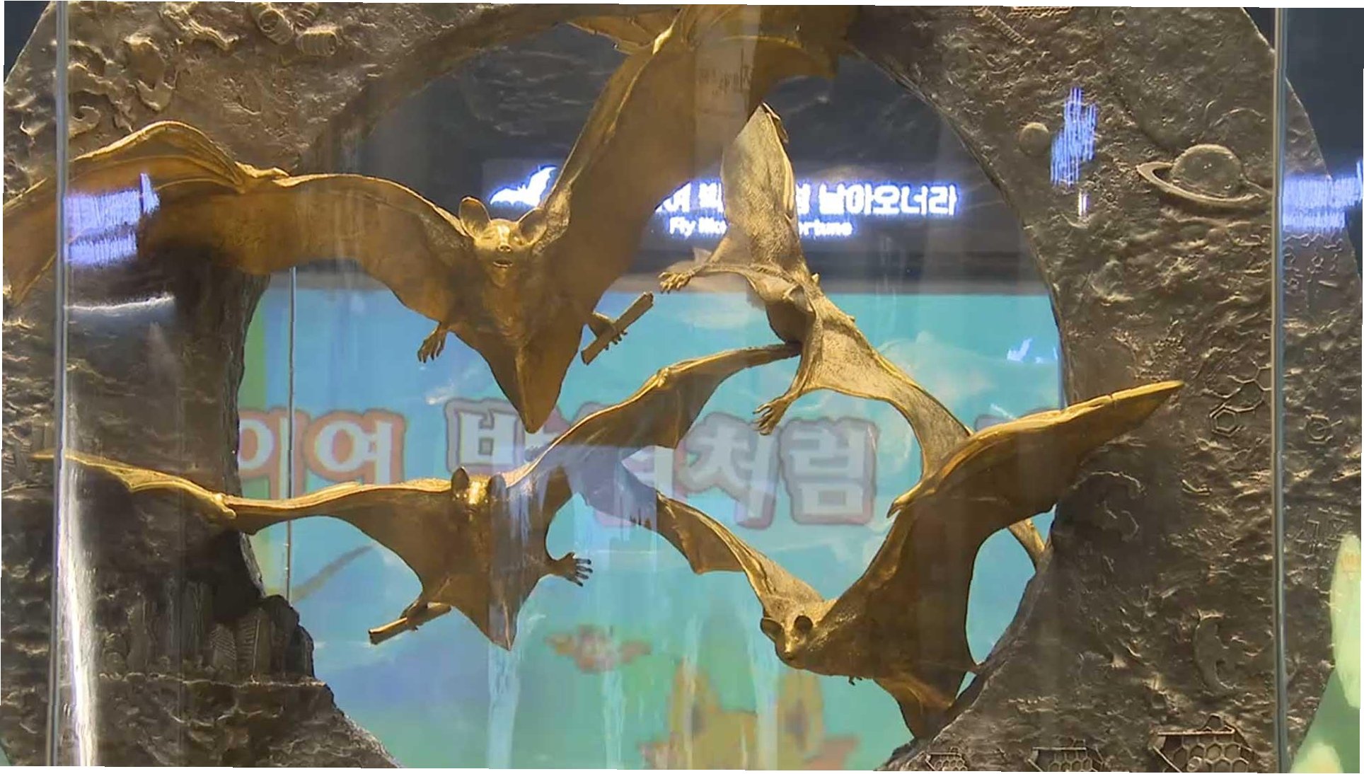 함평의 황금박쥐상은 순금 162kg과 은 281kg을 사용하여 제작된 대형 조형물입니다. 역동적인 모습으로 날개를 펼친 박쥐 네 마리와 새끼 박쥐 한 마리가 조화를 이루고 있습니다. 이는 함평 지역에 서식하는 실제 황금박쥐의 생태적 가치를 담아낸 것으로, 단순한 금·은 조형물을 넘어선 상징성을 지닙니다.