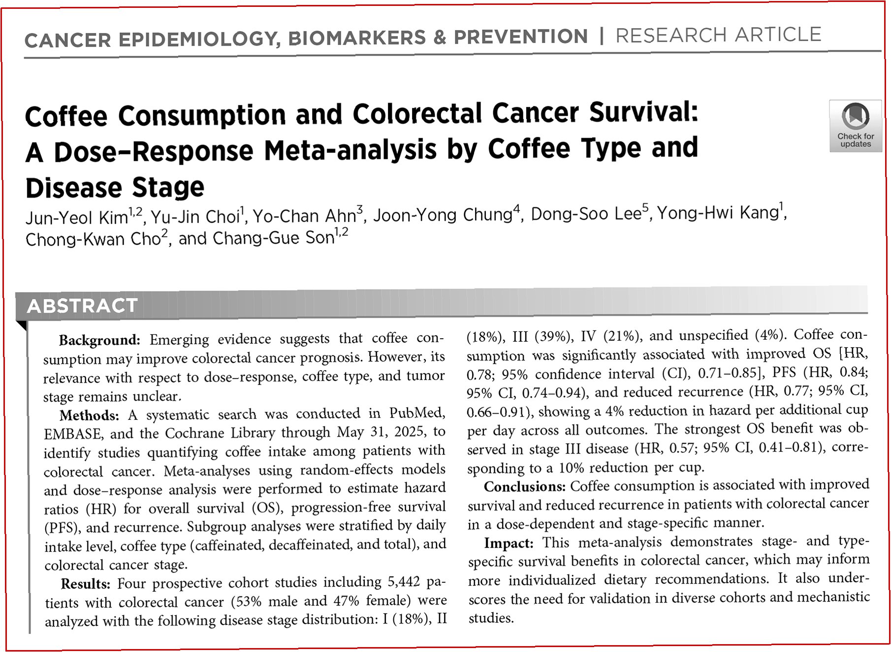A.연구 결과는 커피 섭취가 생존율 향상 및 재발 위험 감소에 긍정적인 영향을 미칠 수 있음을 시사하지만, 인과관계를 확정하기 위해서는 추가 연구가 필요합니다. 개인의 건강 상태에 따라 다를 수 있으므로, 의료 전문가와 상담 후 섭취하는 것이 좋습니다.
