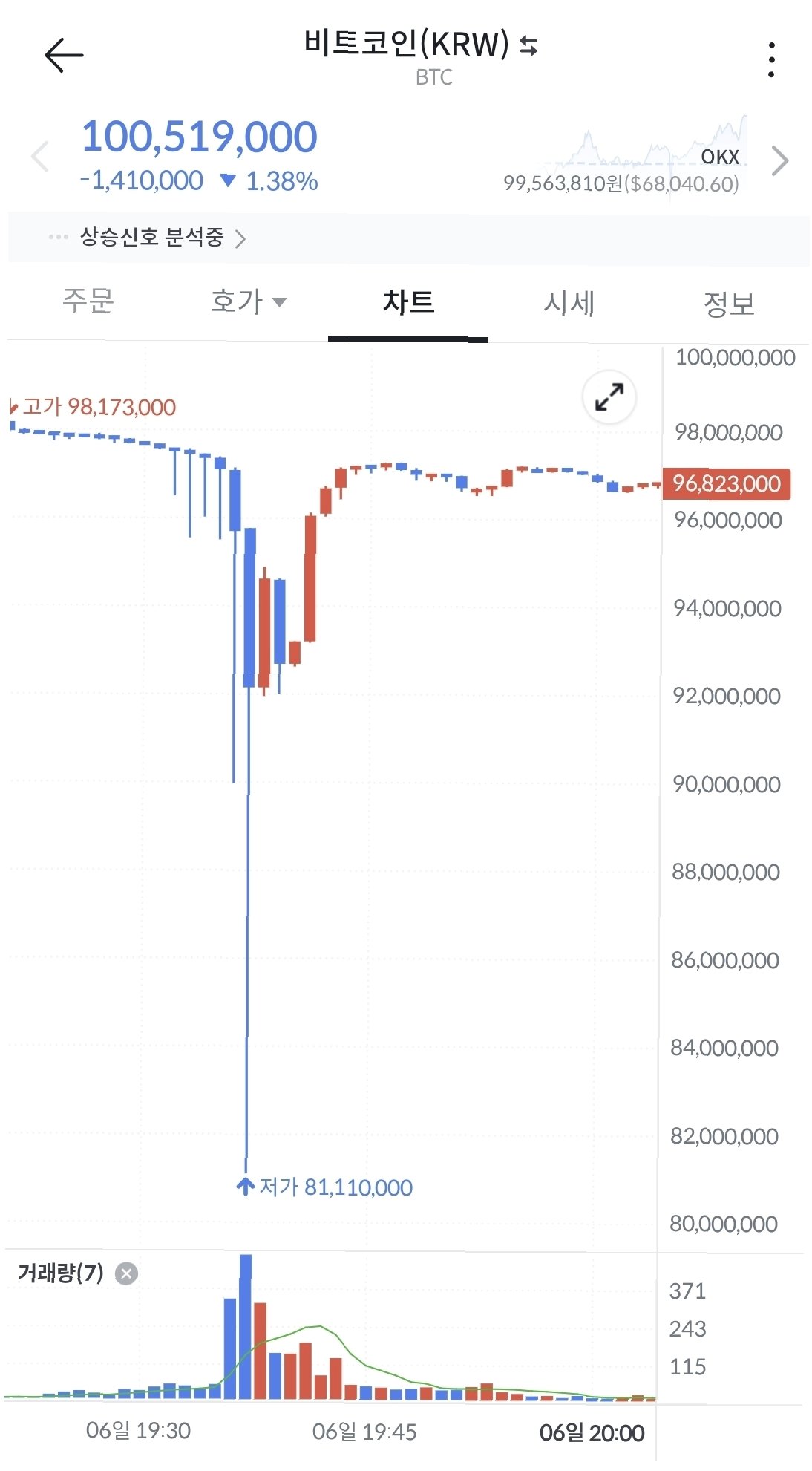 이 사고로 인해 오지급된 비트코인이 시장에 매물로 쏟아지면서 빗썸 내 비트코인 가격이 한때 8100만원대까지 폭락하는 등 큰 혼란이 야기되었습니다. 이는 글로벌 시세보다 16% 이상 낮은 수준으로, 빗썸 측은 사태 파악 직후인 오후 7시 40분경 가상자산 입출금을 전면 차단하고 회수 작업에 착수했습니다. 현재 가격은 회복되었으나 당시의 급격한 변동성은 시장에 큰 충격을 주었습니다.