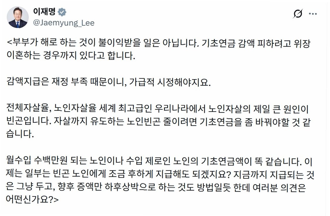 기초연금, 빈곤 노인에게 더… 이재명 대통령, 하후상박 증액 제안