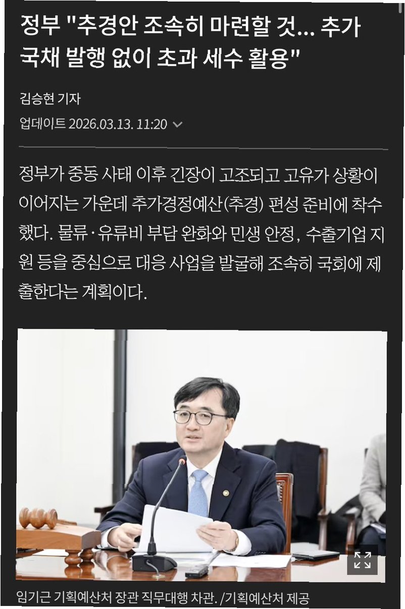 정부가 중동발 고유가 위기에 대응하기 위해 최대 20조 원 규모의 추경 편성을 추진합니다. 이번 추경은 물류·유류비 부담 완화, 서민·소상공인 지원, 수출 기업 지원에 집중되며, 초과 세수를 활용하여 국채 발행 없이 재원을 마련할 계획입니다. 전문가들은 내수 심리 위축 완화를 기대하면서도, 재정 운용의 신중성을 당부했습니다.