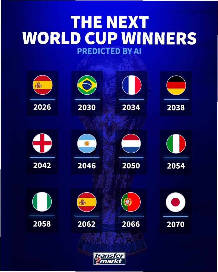 축구 통계 매체 '트랜스퍼마크트'는 다가올 월드컵 우승팀을 예측했습니다. 북중미 월드컵에서는 스페인, 2030 월드컵에서는 브라질이 우승할 것으로 전망했습니다. 흥미롭게도 일본의 월드컵 우승 가능성은 2050년이 아닌 2070년으로 예측되었습니다. 이는 일본 축구가 장기적인 안목으로 꾸준히 발전하고 있음을 시사합니다.