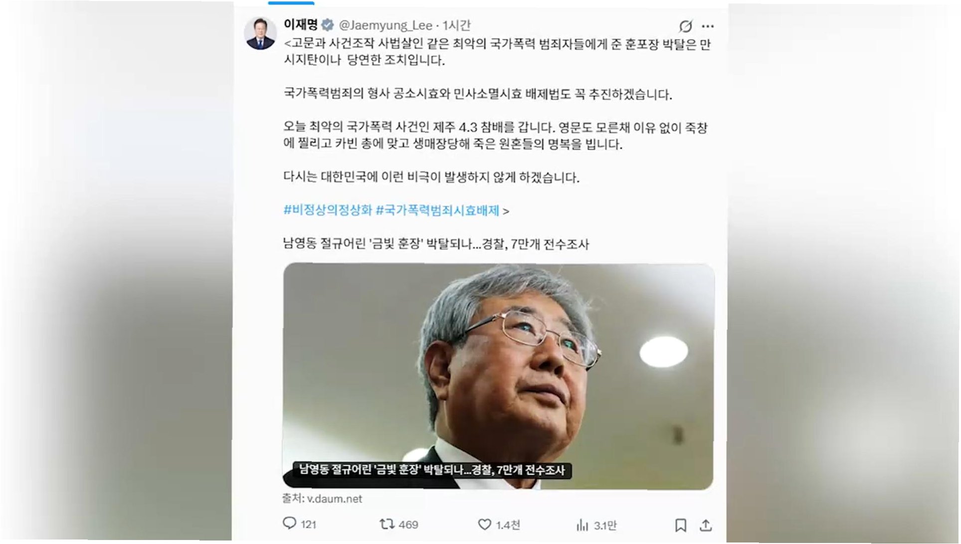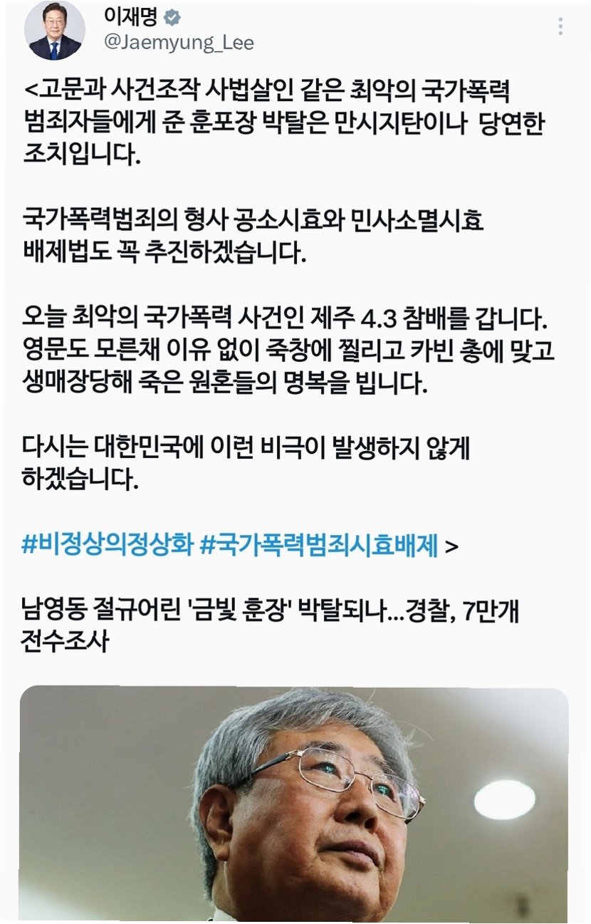 이재명 대통령은 과거 고문과 사건 조작에 가담한 수사기관 관계자들이 받은 서훈에 대해 취소 조치가 착수된 것에 대해 “사법살인 같은 최악의 국가폭력 범죄자에게 준 훈·포장 박탈은 만시지탄이나 당연한 조치”라고 밝혔다. 이는 과거 국가 폭력의 가해자들이 받은 훈장을 박탈하는 것이 당연하며, 이미 늦었지만 꼭 필요한 조치임을 강조하는 발언이다. 이 대통령은 해당 내용을 X(옛 트위터)에 링크하며 자신의 입장을 분명히 했다.