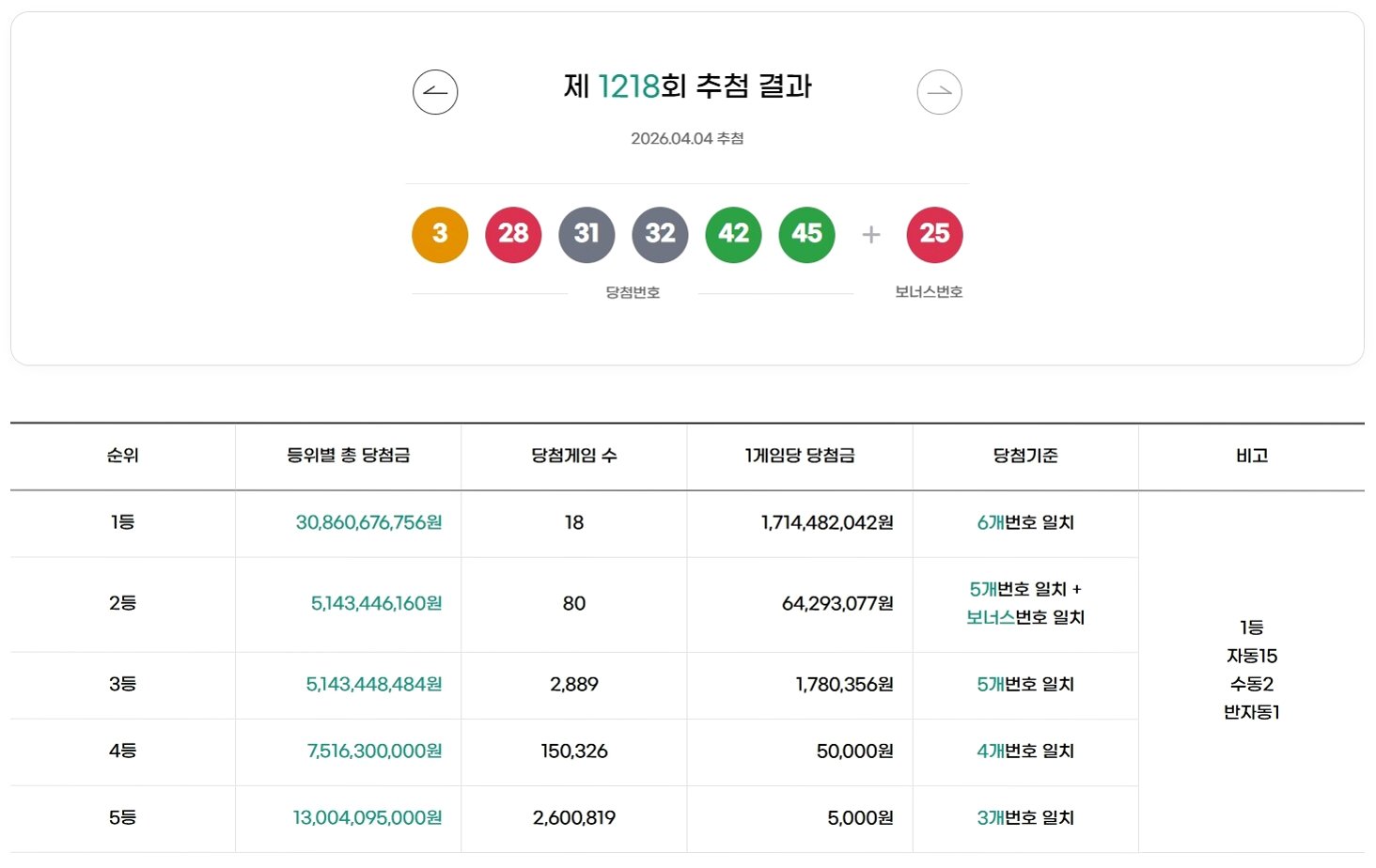 제1218회 로또 추첨 결과, 1등 당첨번호는 '3, 28, 31, 32, 42, 45'로 총 18명이 각 17억여 원의 당첨금을 받게 되었습니다. 2등부터 5등까지도 수많은 당첨자가 나오며 로또의 뜨거운 열기를 실감케 했습니다.