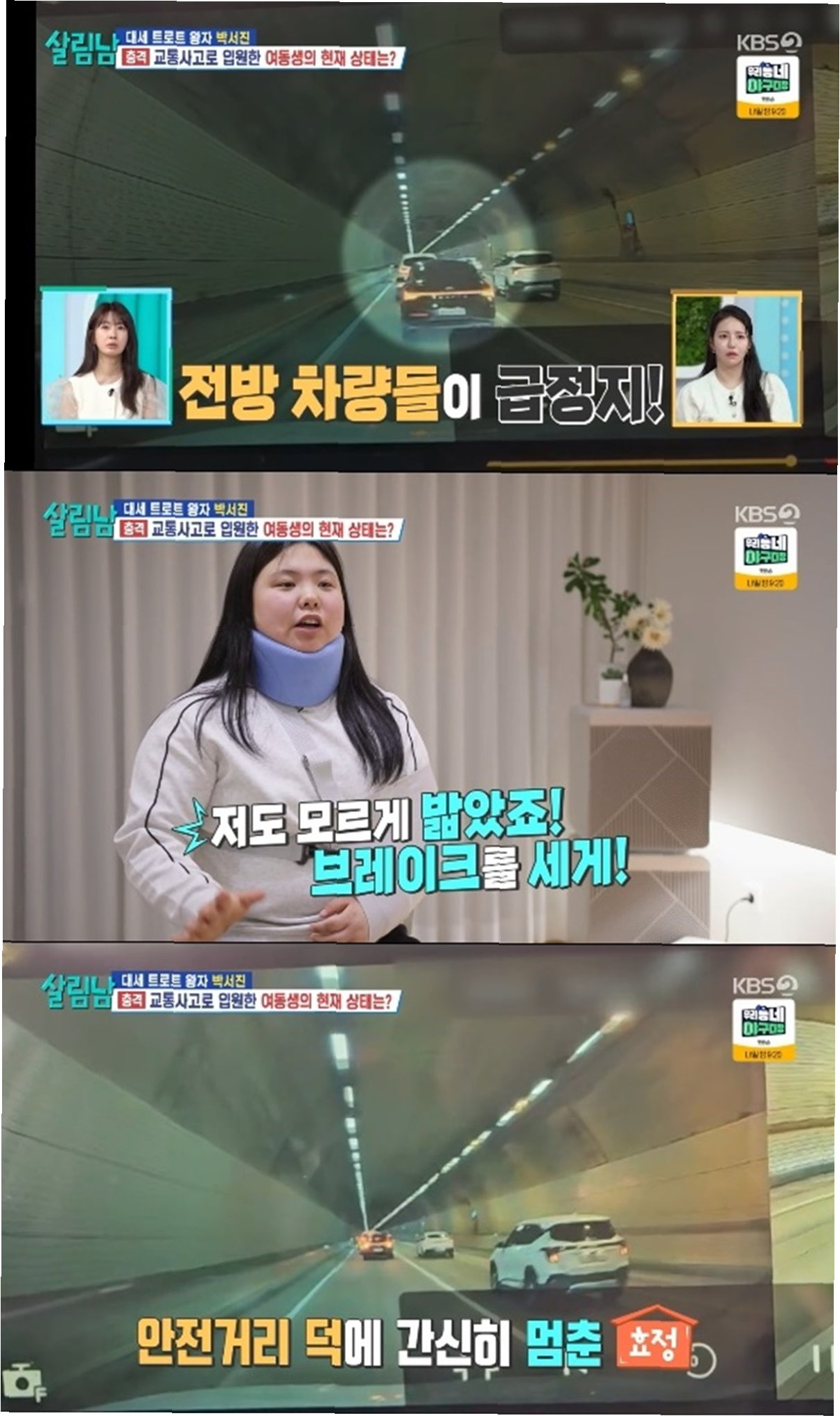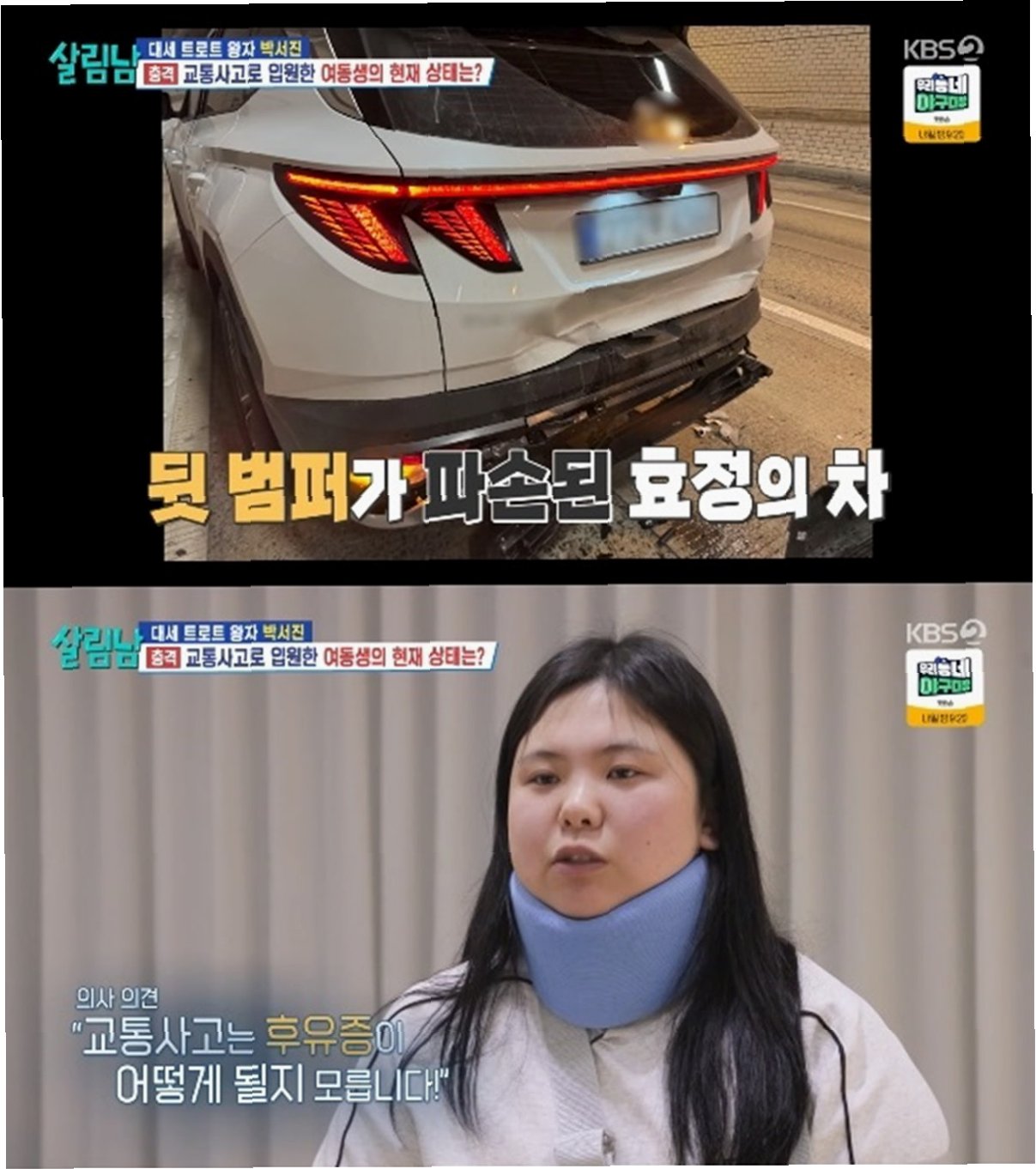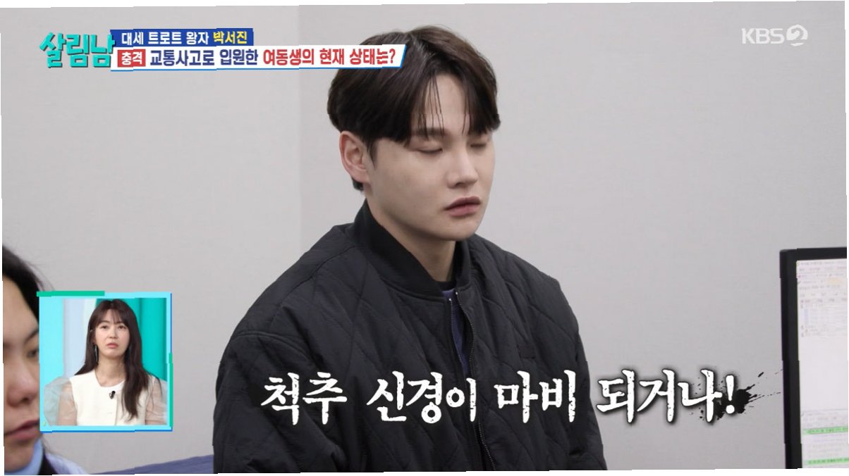 가수 박서진이 교통사고로 병상에 누운 동생 효정을 지극정성으로 돌보는 모습이 공개됩니다. 오는 11일 방송되는 KBS 2TV ‘살림하는 남자들 시즌2’에서는 터널 내 추돌 사고로 심각한 위기를 맞은 효정과 이를 간병하는 박서진의 이야기가 그려집니다. 박서진은 사고 당시 블랙박스 영상을 보고 큰 충격을 받았으며, 의사로부터 '신경 마비로 이어질 수 있다'는 소견을 듣고 망연자실했습니다.