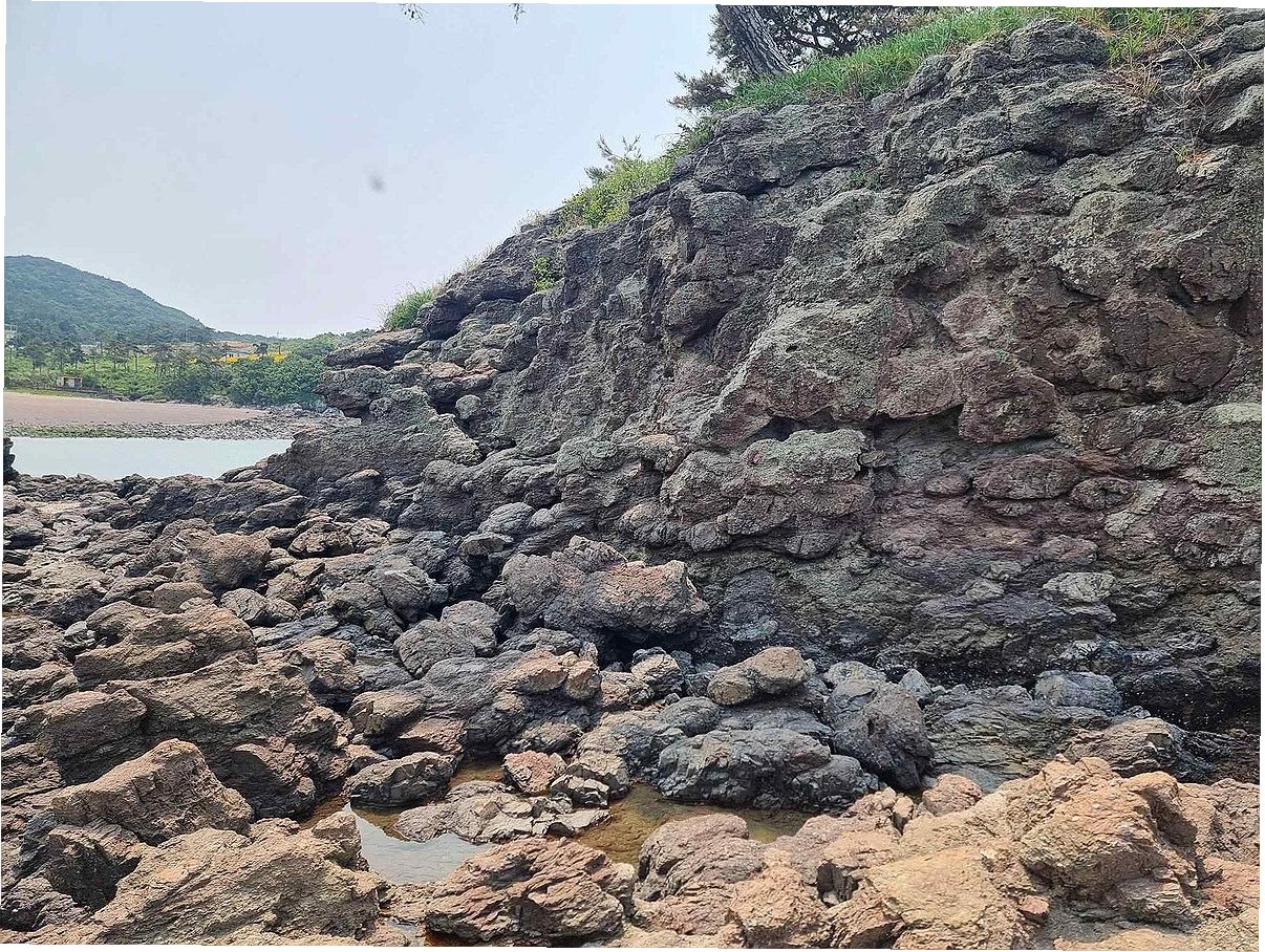 붉은 절벽과 포도송이 화산암의 조화: 자연이 빚은 절경, 천연기념물로 지정되다