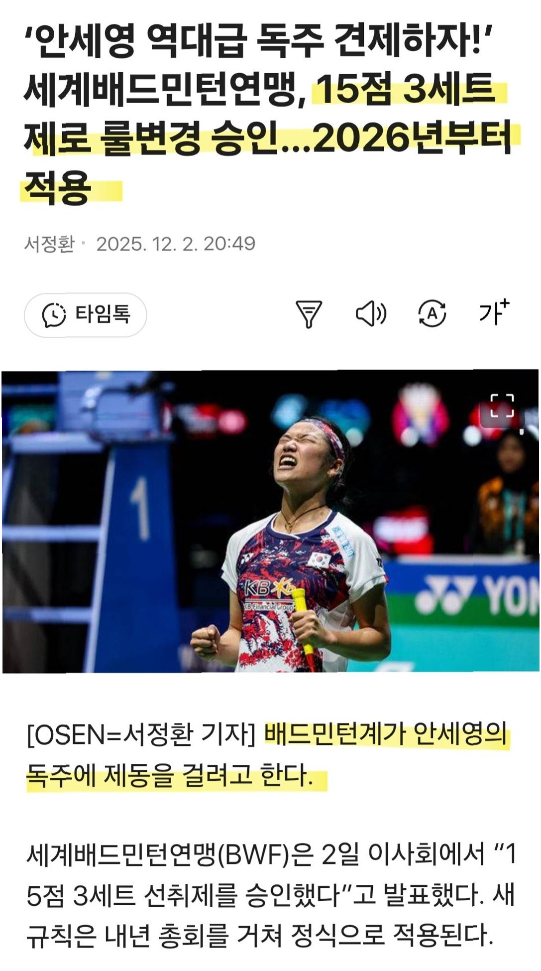 안세영, 숙적 야마구치 아카네와 다시 만난다여자 단식 세계 랭킹 1위 안세영이 '숙적' 야마구치 아카네와 또다시 맞붙게 되었습니다. 2025 세계배드민턴연맹(BWF) 월드투어 파이널 준결승 조 추첨 결과, 안세영은 야마구치와 리턴 매치를 펼치게 되었습니다. 이는 안세영에게 얄궂은 운명과도 같은 상황입니다. 조별리그에서의 치열했던 접전안세영은 전날 열린 조별리그 A조 3차전에서 야마구치와 격돌했습니다. 두 선수는 팽팽한 라이벌 관계를 형성하며, 객관적인 실력으로 보았을 때 야마구치는 안세영에게 늘 어려운 상대였습니다. 경기 전, 많은 매체에서 야마구치를 안세영의 강력한 대항마로 꼽았습니다. 1게임 충격패, 그러나 이어진 역전 드라마1게임에서 안세영은 야마구치의 페이스에 밀려 14-21로 패했습니..